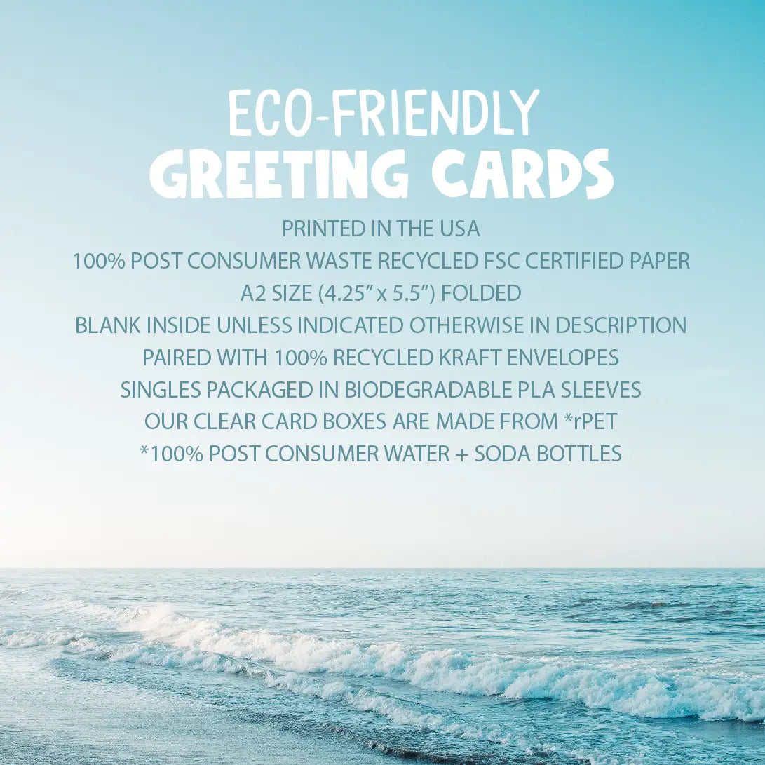 · Blank Inside· Mini Size 2.5" x 3.5"· Printed in the USA on heavy 100% PCW recycled paper· Paired with a white envelope· Single enclosures packaged in a cello sleeve· Boxed enclosures packaged in a clear box with back label