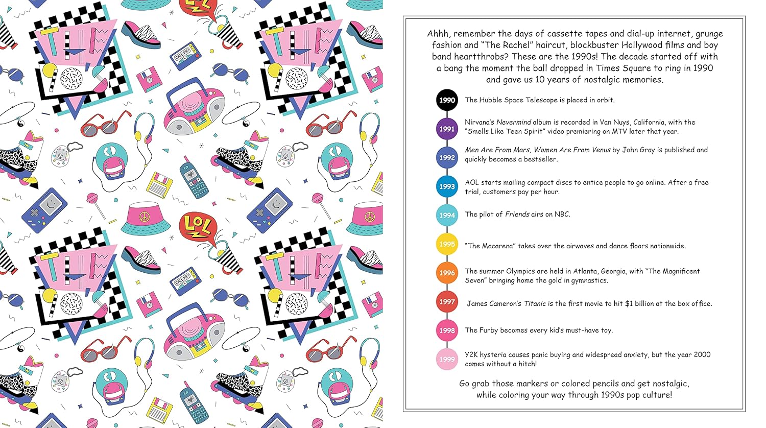 Grab your coloring tools and travel back to the days of cassette tapes and dial-up internet, grunge fashion and “The Rachel” haircut, Blockbuster Hollywood films and boy band heartthrobs with your copy of Best of the ’90s Coloring Book!