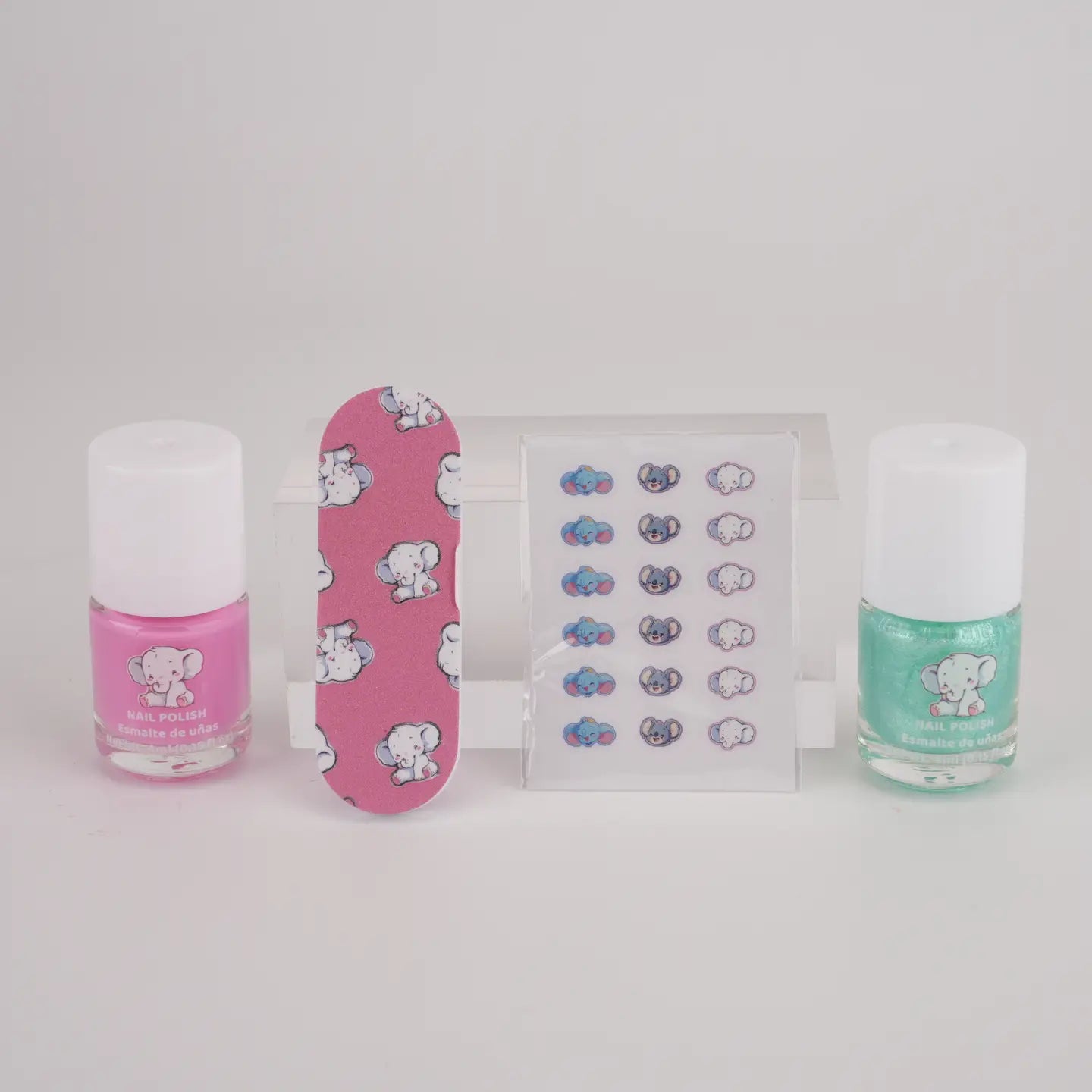 Cute Elephant Kids Nail Art Kit (Vegan • Kid-Safe • Ages 3+) A charming, gift-ready nail art kit designed especially for little ones! This Elephant Nail Art Set includes kid-safe, water-based nail polish plus matching nail stickers and a mini nail file.