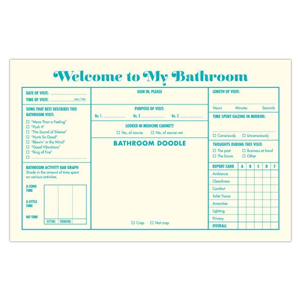 No ordinary guest book, this throne-room tome offers provocative prompts and ample doodle space to help your guests express themselves for posterity. Who hasn't had a deep thought on the can?