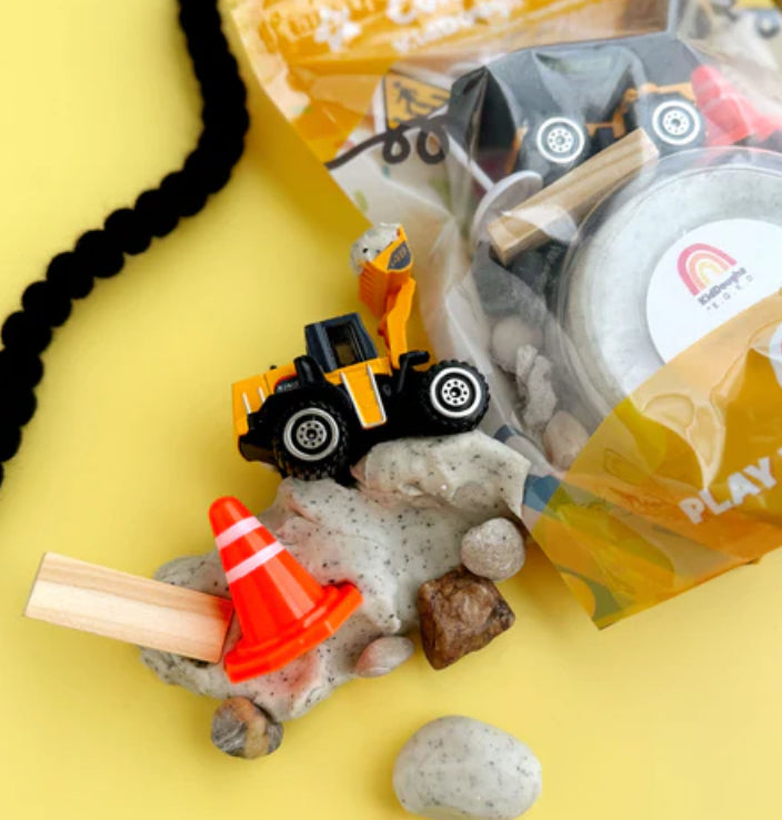 Includes: 8 oz Textured Grey (Cookies & Cream) KidDough, Construction Vehicle, Shovel, Wood Beams, Safety Cone, Construction Signs, Black Acrylic Stones, and Assorted Natural Stones