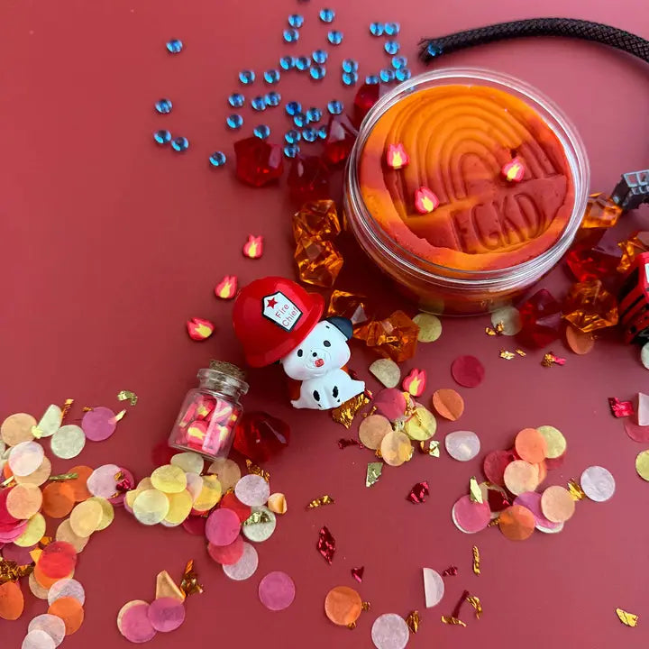 Includes: 8 oz Red and Orange Marbled (Cherry Mango) KidDough, 2 Jars of Mix Ins (Fire and Water Beads), Dalmatian Puppy, Fire Hydrant, Red and Orange Acrylics.