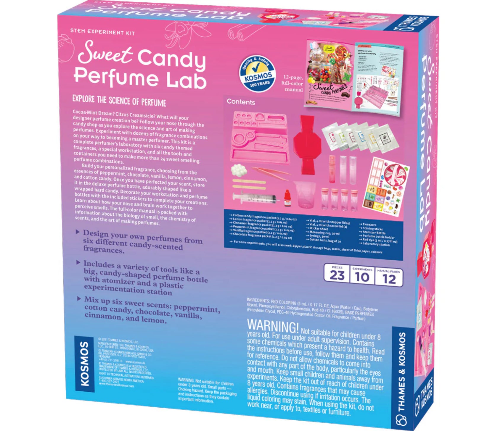 + Includes a variety of tools like a big, candy-shaped perfume bottle with atomizer and a plastic experimentation station