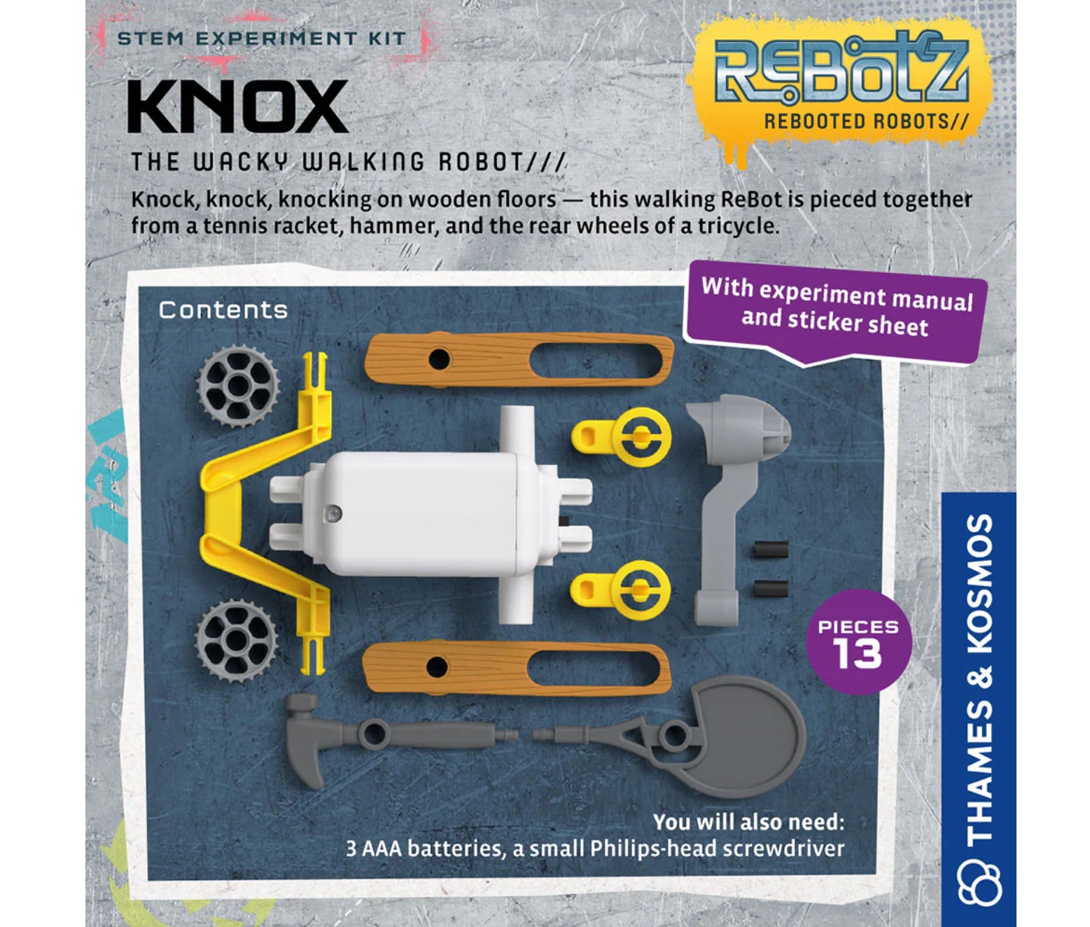 Knock, knock, knocking on wooden floors — this wacky walking ReBot is pieced together from a tennis racket, hammer, and the rear wheels of a tricycle.