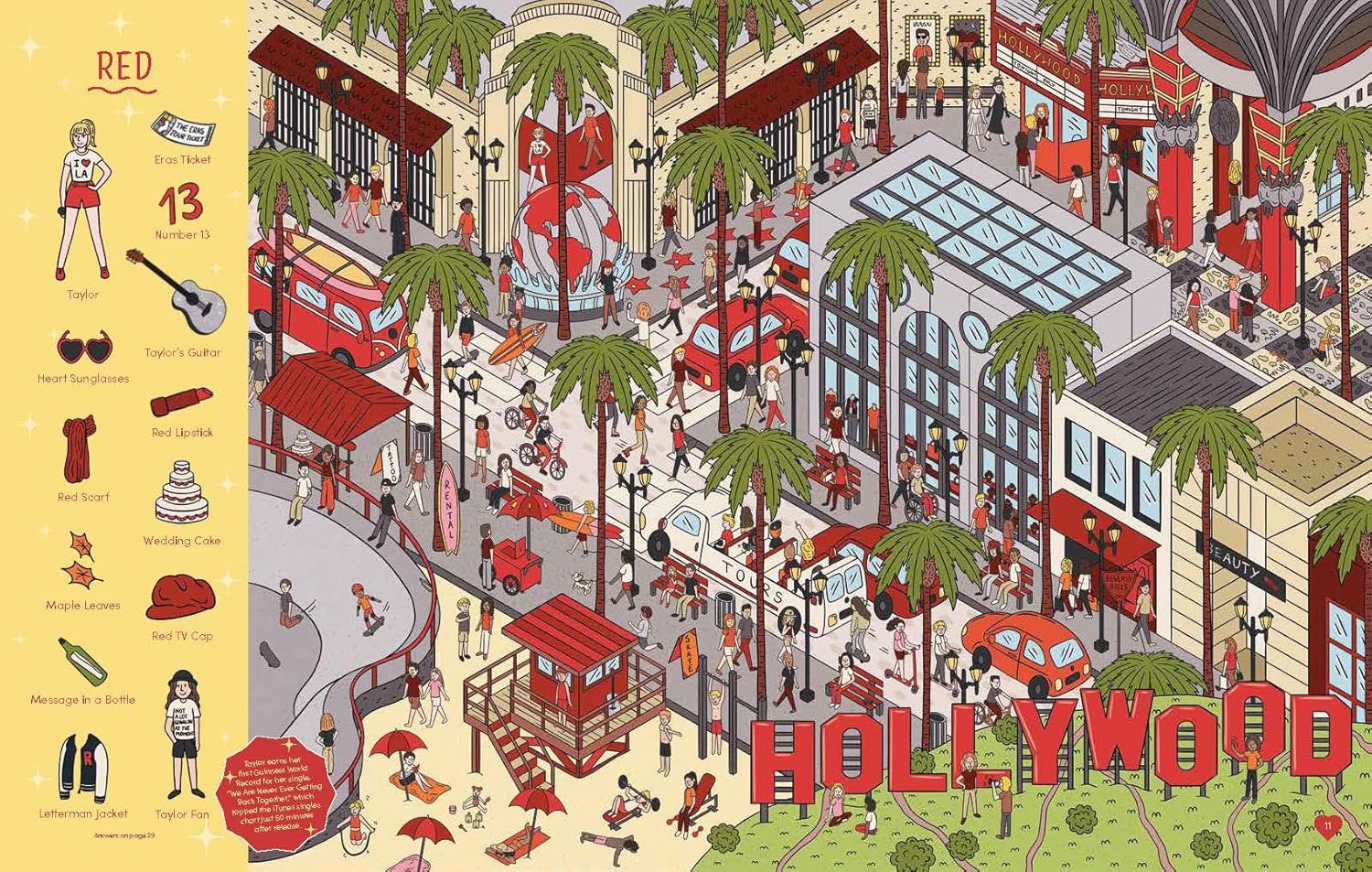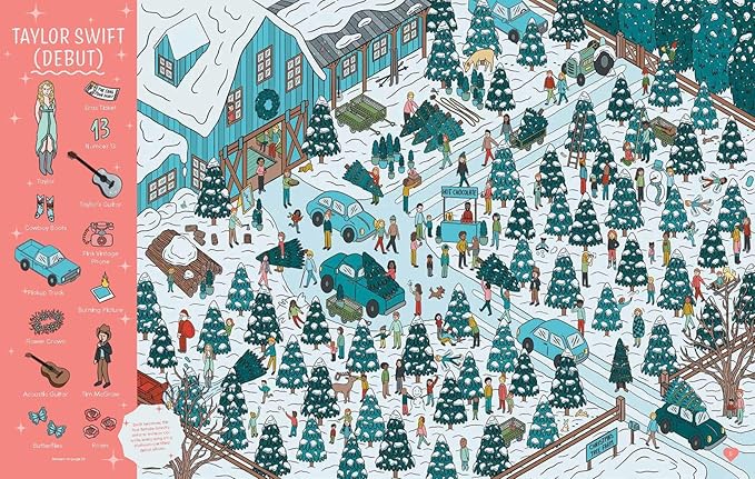 From her first step into the limelight to her multi-platinum albums and sold-out world tours, get lost in the colorful visual puzzles of Unofficial Where’s Taylor? as you look for Taylor and other objects in New York City, Nashville, an amusement park, a Christmas tree farm, and more! Besides Taylor, items to be found include: