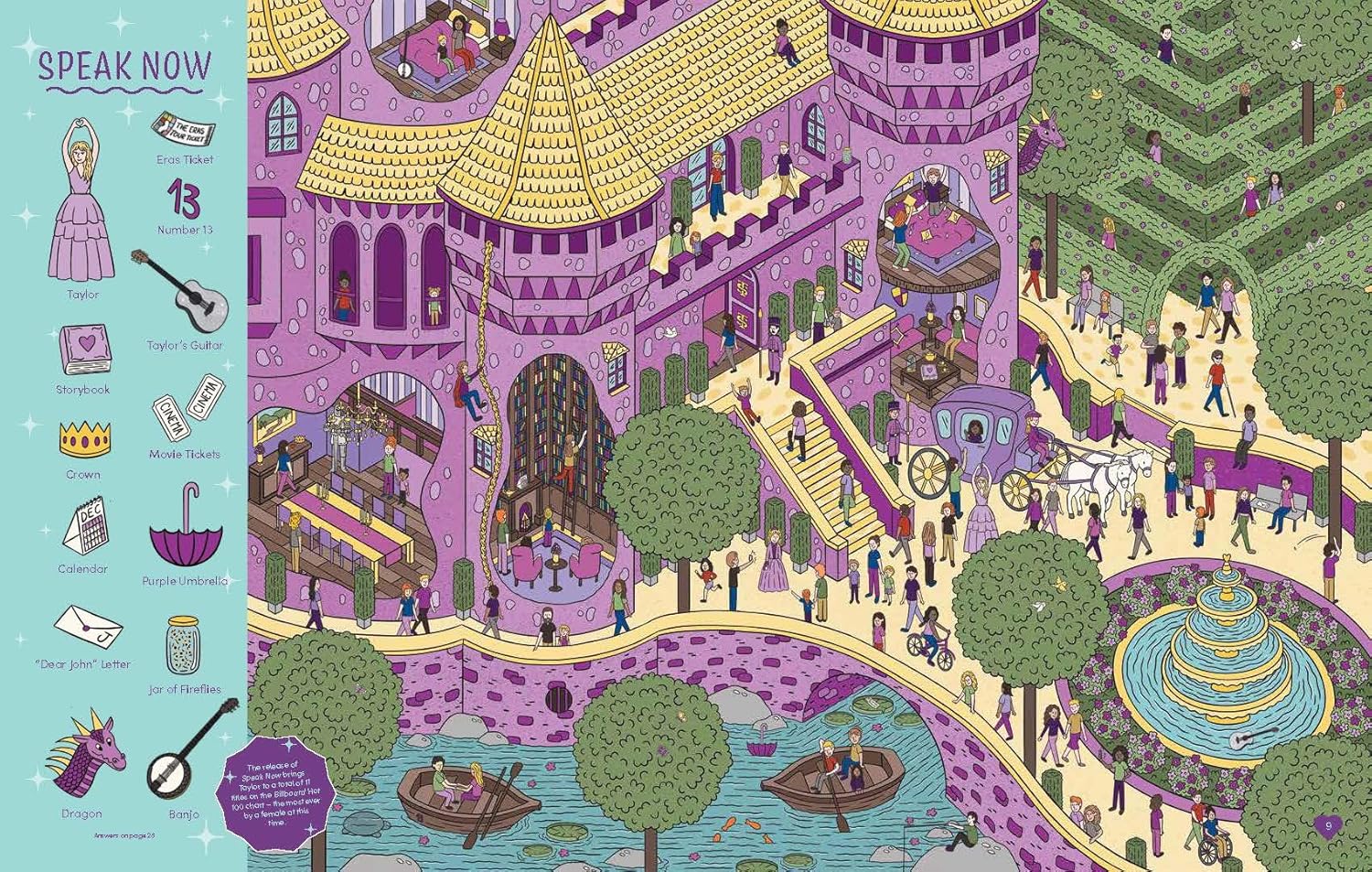 Can you find the world’s biggest superstar? Peruse the vibrant era-themed scenes to find the items inspired by the extraordinary music and career of Taylor Swift.