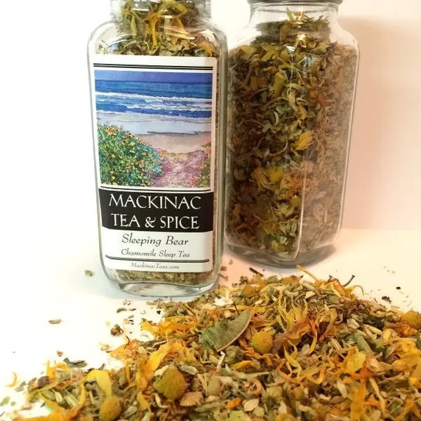 Sleeping Bear- A Sleepy Time Tea/Dream Tea/De-Stress/Relaxing/Night Time Tea A quiet night in a cup, you can almost hear the waves lapping against the dunes. A Sandmans dream come true. Hand packed into 8 oz bottles for over 40 cups of Tea. Ingredients: Chamomile, Oatstraw, Linden Flower, Catnip, Lemon Verbena, Fennel, Skullcap, Wild Lettuce, Nutmeg and Calendula. Caffeine Free