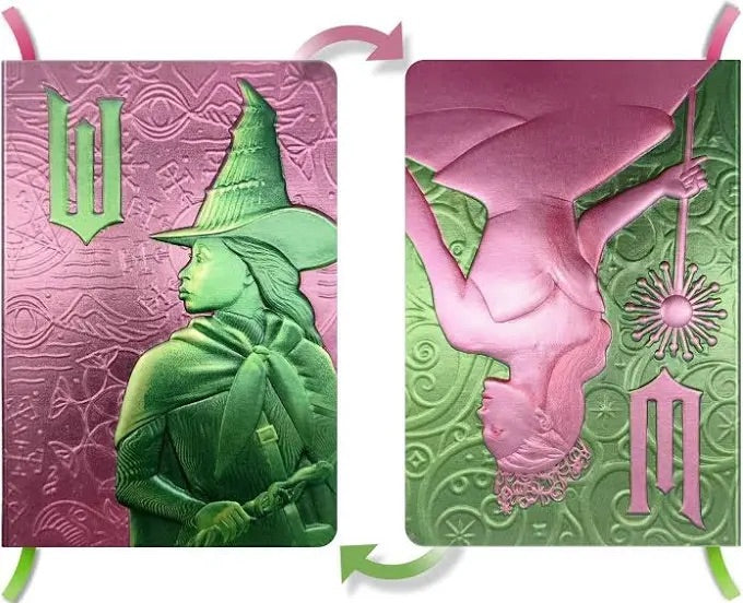 This collectible, hardcover journal has an eye-catching, sculpted cover featuring intricate artwork from Universal Pictures' cinematic event, Wicked. The perfect place to note your thoughts in style, this 184-page collectible journal is a stylish gift for any Wicked fan. This reversible journal can be flipped to present either Elphaba Thropp's or Glinda Upland's profiles, with internal pages in soft shades of green and pink and with a satin placeholder ribbon. QUALITY CONSTRUCTION: This journal features a stunningly detailed, molded hardcover with metallic finish, 184-ruled pages of premium paper, plus a satin ribbon marker to ensure you never lose your place for daily updates. CONVENIENT SIZE: This 5.75" x 8.25" journal is a comfortable size and easily fits in a bag or backpack to keep with you on the go. PERFECT FOR FANS: Styled with iconic imagery, this elegant, sculpted journal is an elevated, wonderful gift and must-have for any fan.